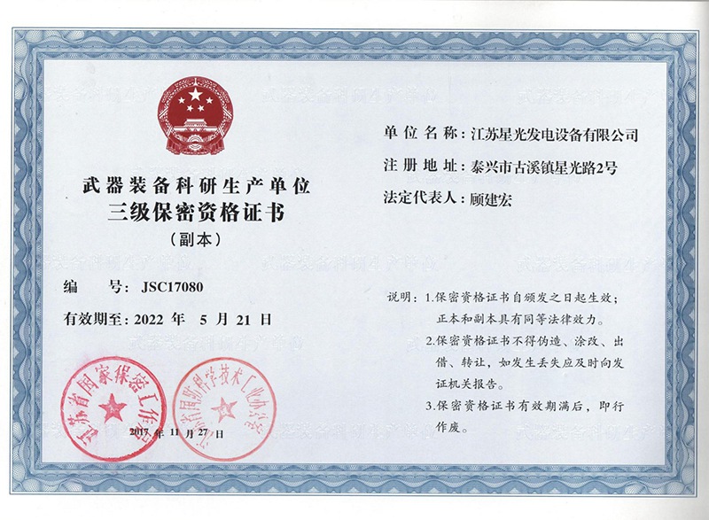 武器裝備科研生產(chǎn)單位三級(jí)保密證書(shū)(副本)