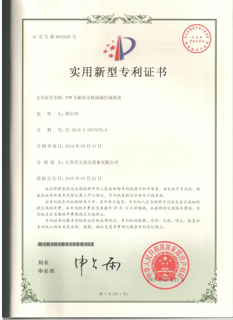 TFW 無刷發(fā)電機勵磁恒流裝置-專利證書
