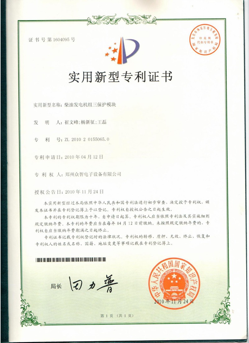 控制箱一體式TFW 無刷發(fā)電機-專利證書
