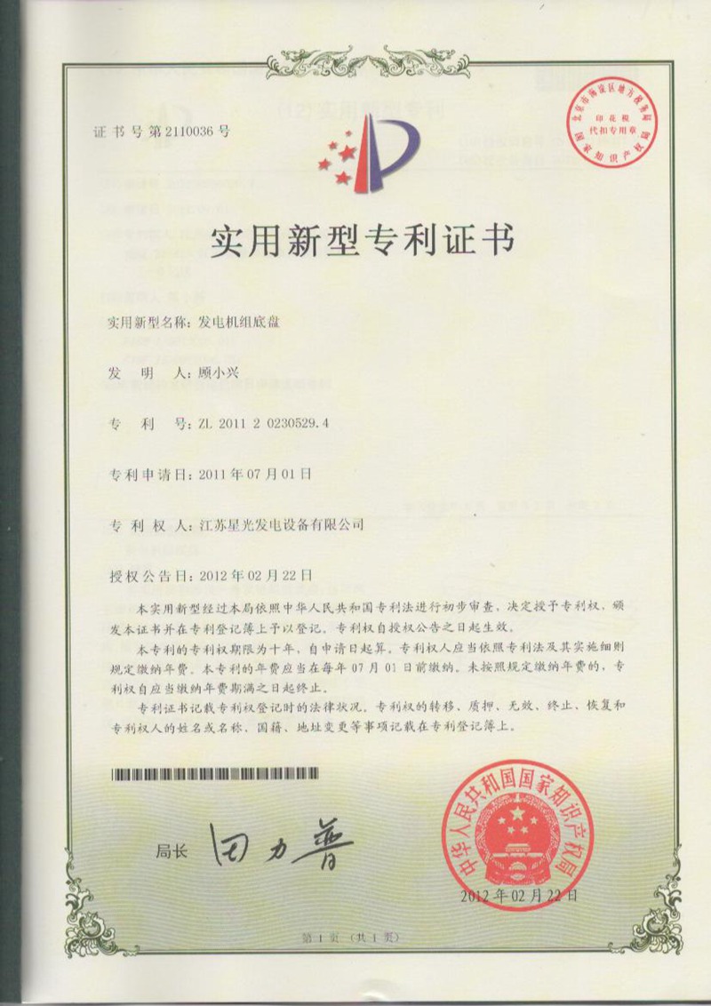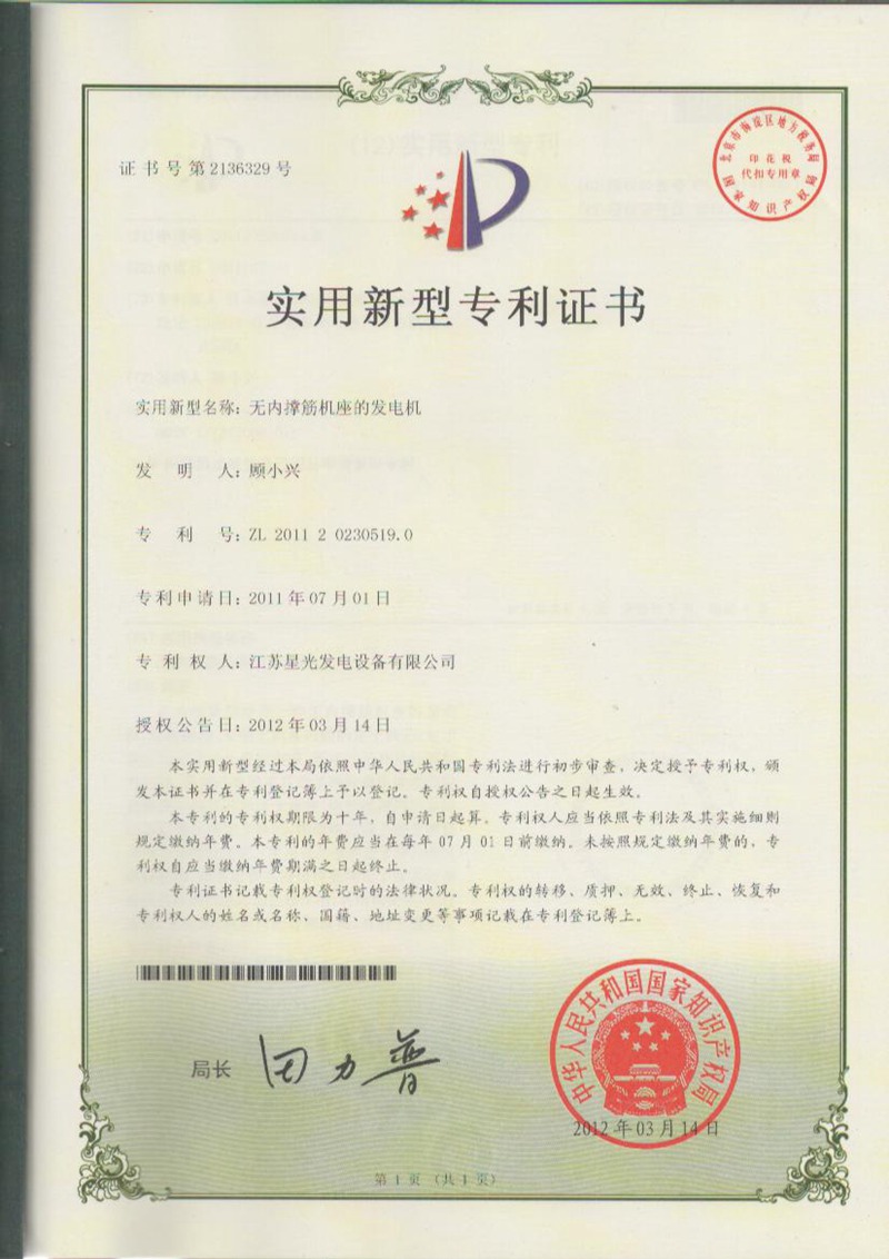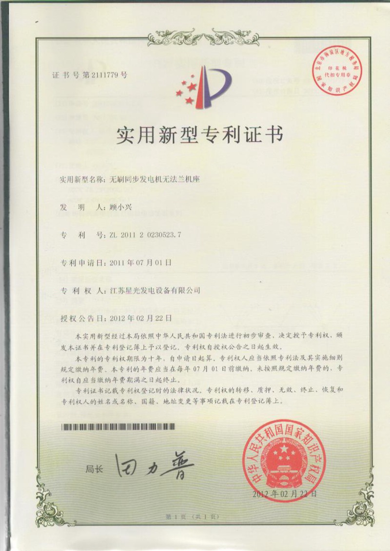 無刷同步發(fā)電機無法蘭機座-專利證書
